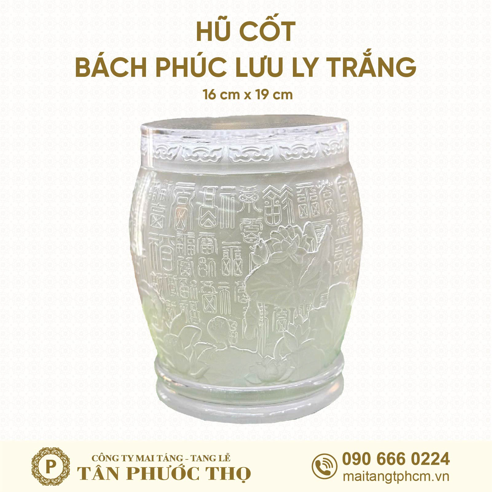 Hũ Cốt Cao Cấp Ngọc Lưu Ly Bạch Bách Phúc là loại hũ cốt trang trọng và cao cấp, hình trụ nắp tròn, giá thành tương đối cao, được sử dụng trong các tang lễ trang trọng