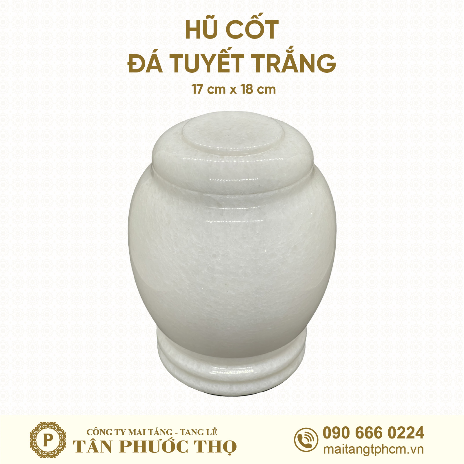 Hũ cốt đá tuyết trắng là loại hũ cốt trang trọng và cao cấp, hình hộp vuông khắc thánh giá, giá thành tương đối cao, được sử dụng trong các tang lễ trang trọng