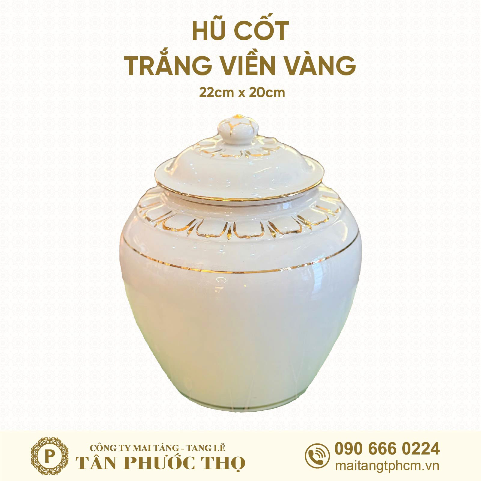 Hũ cốt trắng viền vàng là loại hũ cốt trang trọng và cao cấp, hình hộp vuông khắc thánh giá, giá thành tương đối cao, được sử dụng trong các tang lễ trang trọng