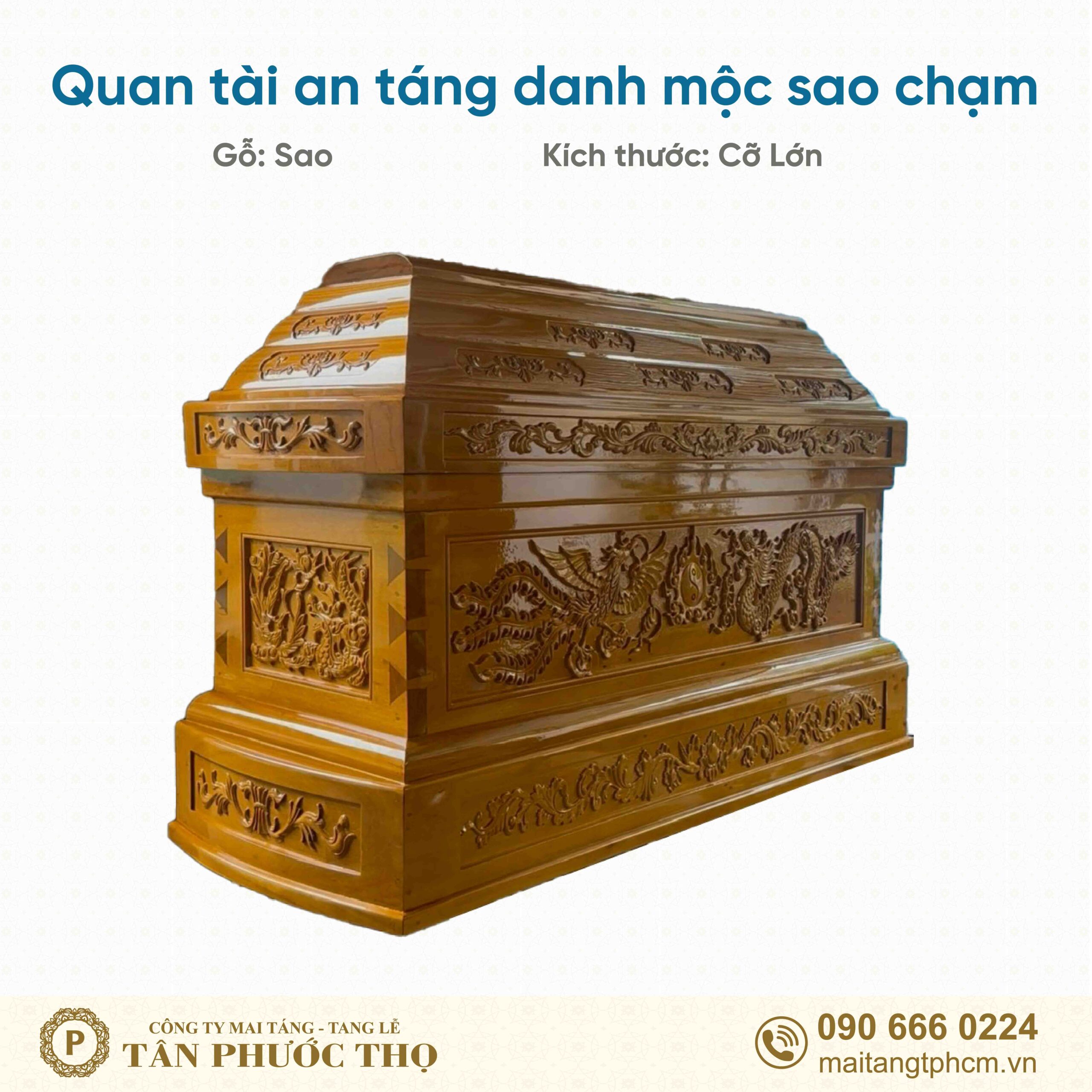 Là mẫu quan tài địa táng (quan tài an táng) phổ thông cỡ lớn. Được làm từ danh mộc Sao, kích cỡ lớn, chạm hình rồng phụng, 1 loại danh mộc loại 3 có giá thành tốt nhưng vẫn đảm bảo được chất lượng gỗ cứng, không cong vênh, chống mói mọt. Danh Mộc Sao là loại danh mộc có vân gỗ đẹp, liền lạc và rất chắc. Đặc điểm nữa là ít co ngót, sức chống tách cao và thẳng.