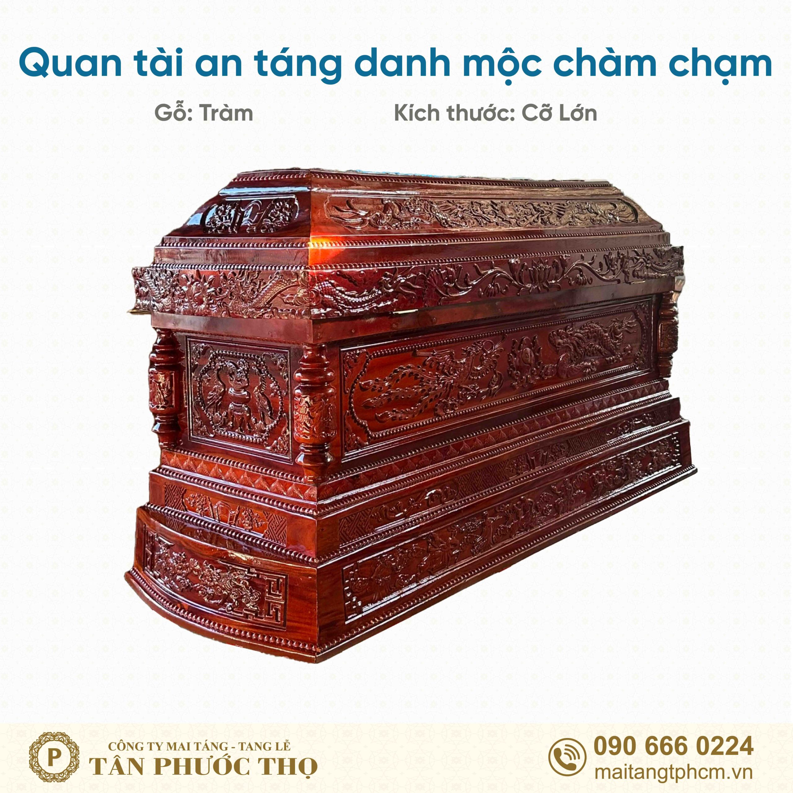 Là mẫu quan tài địa táng (quan tài an táng) gỗ tràm cỡ lớn, chạm khắc chi tiết rồng phụng tinh xảo. Gỗ tốt , cứng, độ bền cao, giá thành tốt.